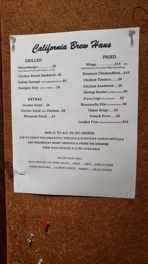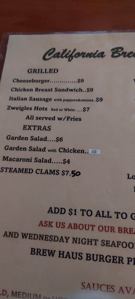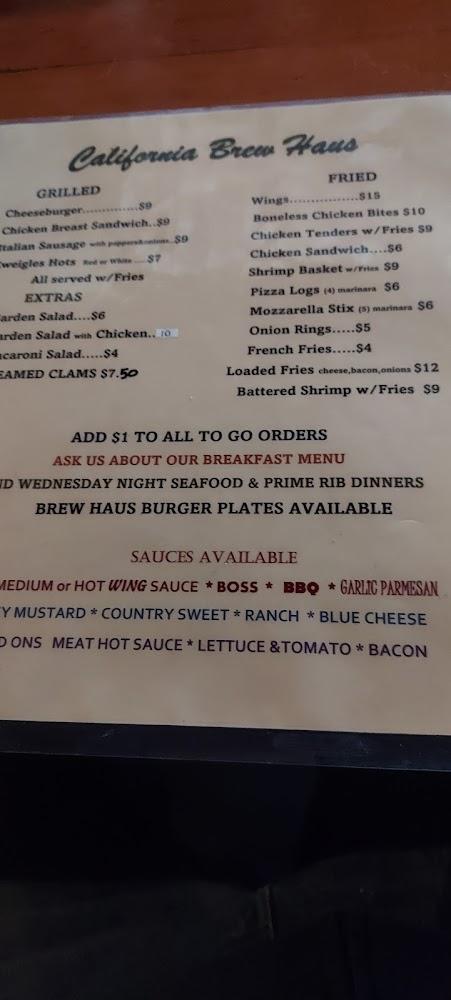 The menu at California Brew Haus centers on simple, hearty dishes and flavorful drinks. It attracts diners looking for classic comfort food in a casual setting. Offerings include a variety of grilled items and traditional favorites, alongside creative cocktails.